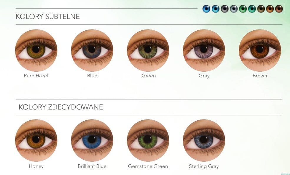 - Dostępne w 12 zjawiskowych kolorach: Honey, Brilliant Blue, Gemstone Green, Sterling Gray, Pure Hazel, Blue, Green, Gray, Brown, Turquoise, Amethyst, True Sapphire